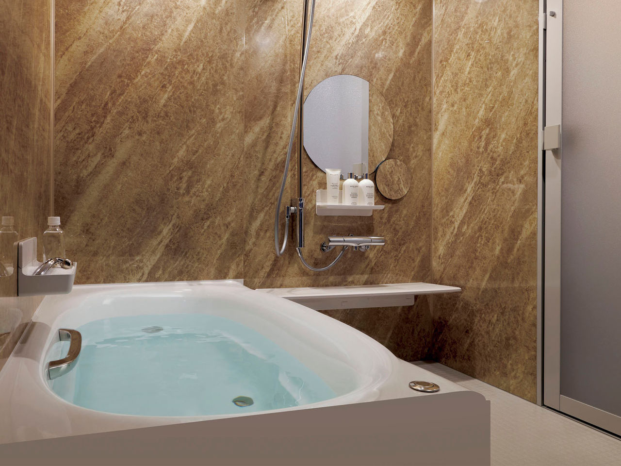 リノビオVの最大の特徴は、独自の「人造大理石浴槽(ルフレストーン)」が標準装備されていること。大理石のような奥行きのある輝きと、滑らかな肌触りが、毎日の入浴をワンランク上の時間に変えてくれます。