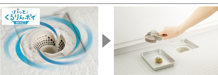 ・パッとくるりんポイ排水口:渦の力で髪の毛をまとめ、捨てるのも簡単です。