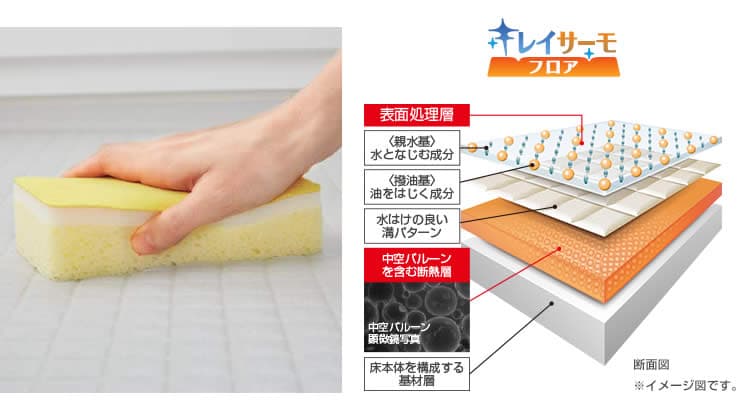 ・キレイサーモフロア:足ピタパターンで滑りにくく、溝が浅いのでスポンジ掃除もラクラク